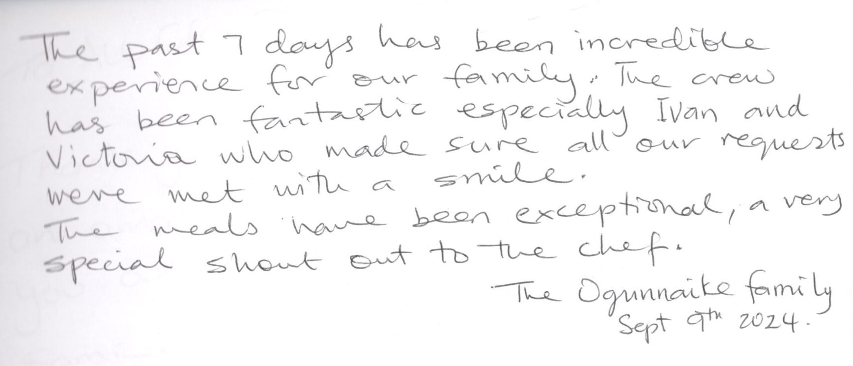The past 7 days has been incredible experience for our family. The crew has been fantastic especially Ivan and Victoria who made sure all our requests were met with a smile.