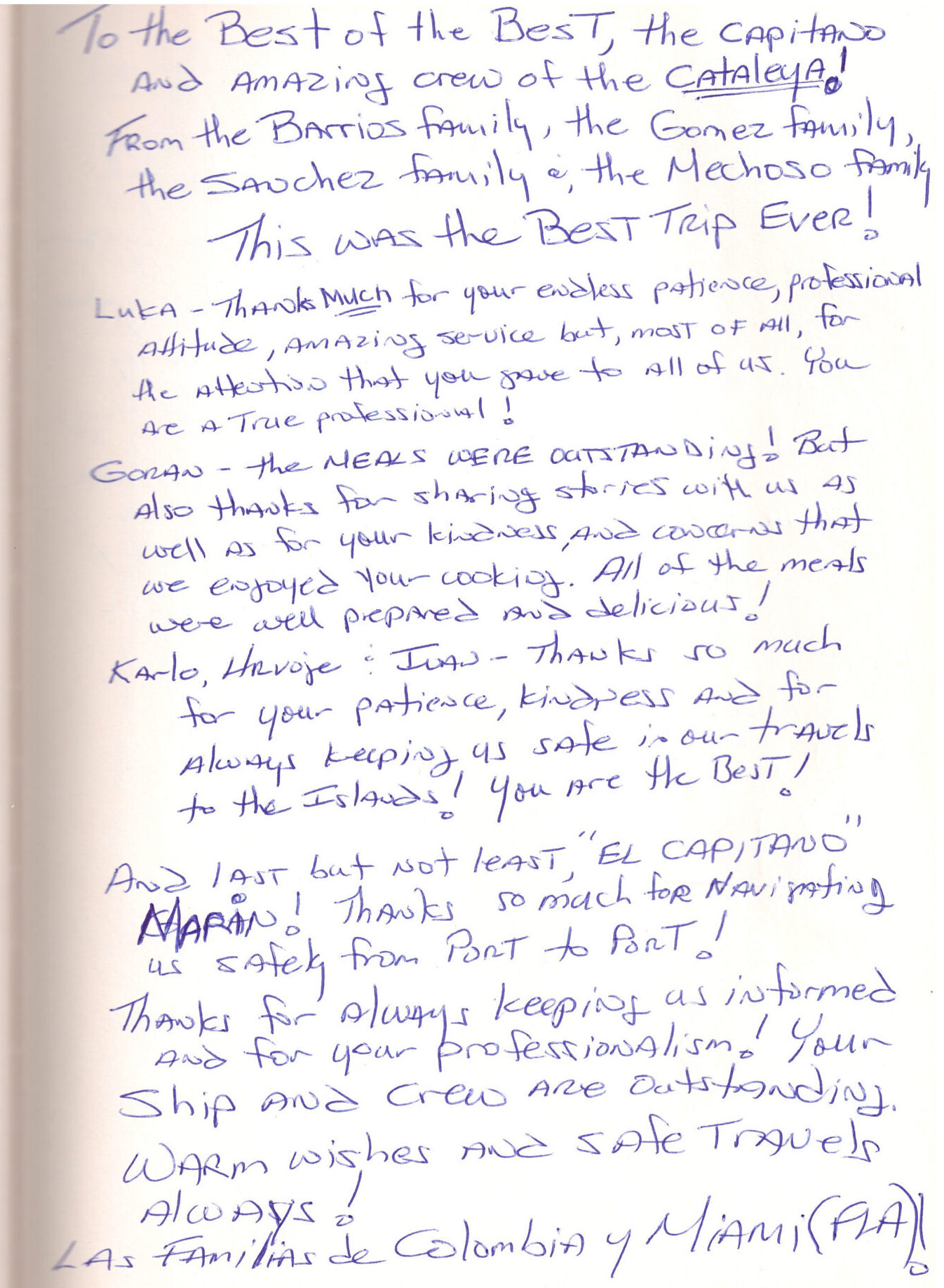 The delicious food + drink, hospitality, folk music and camaraderie with the crew provided the perfect backdrop for an unforgettable experience. We will miss all of it and you (our wonderful crew!) when we return to the States. We will never forget our amazing vacation on the Cataleya.