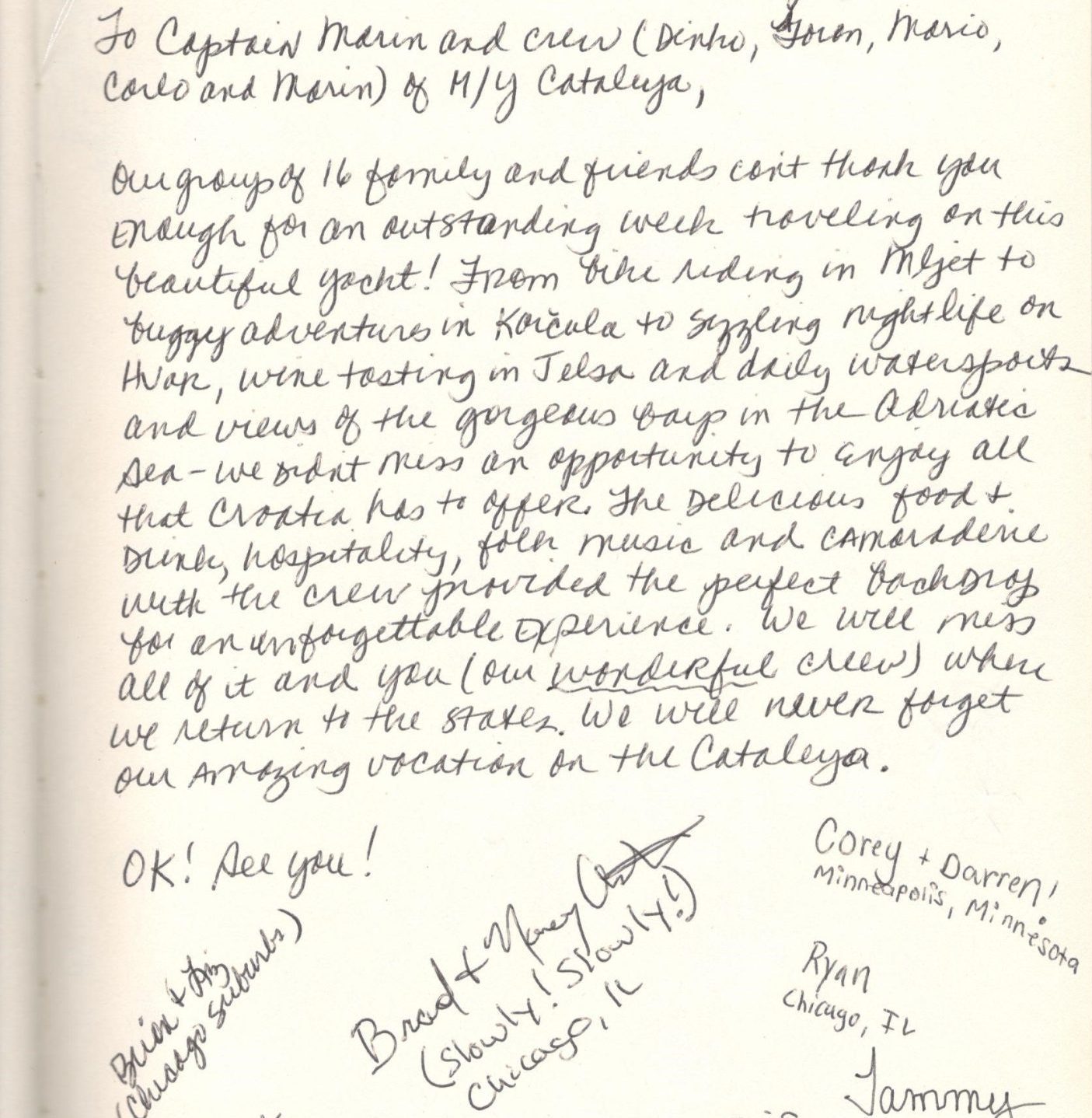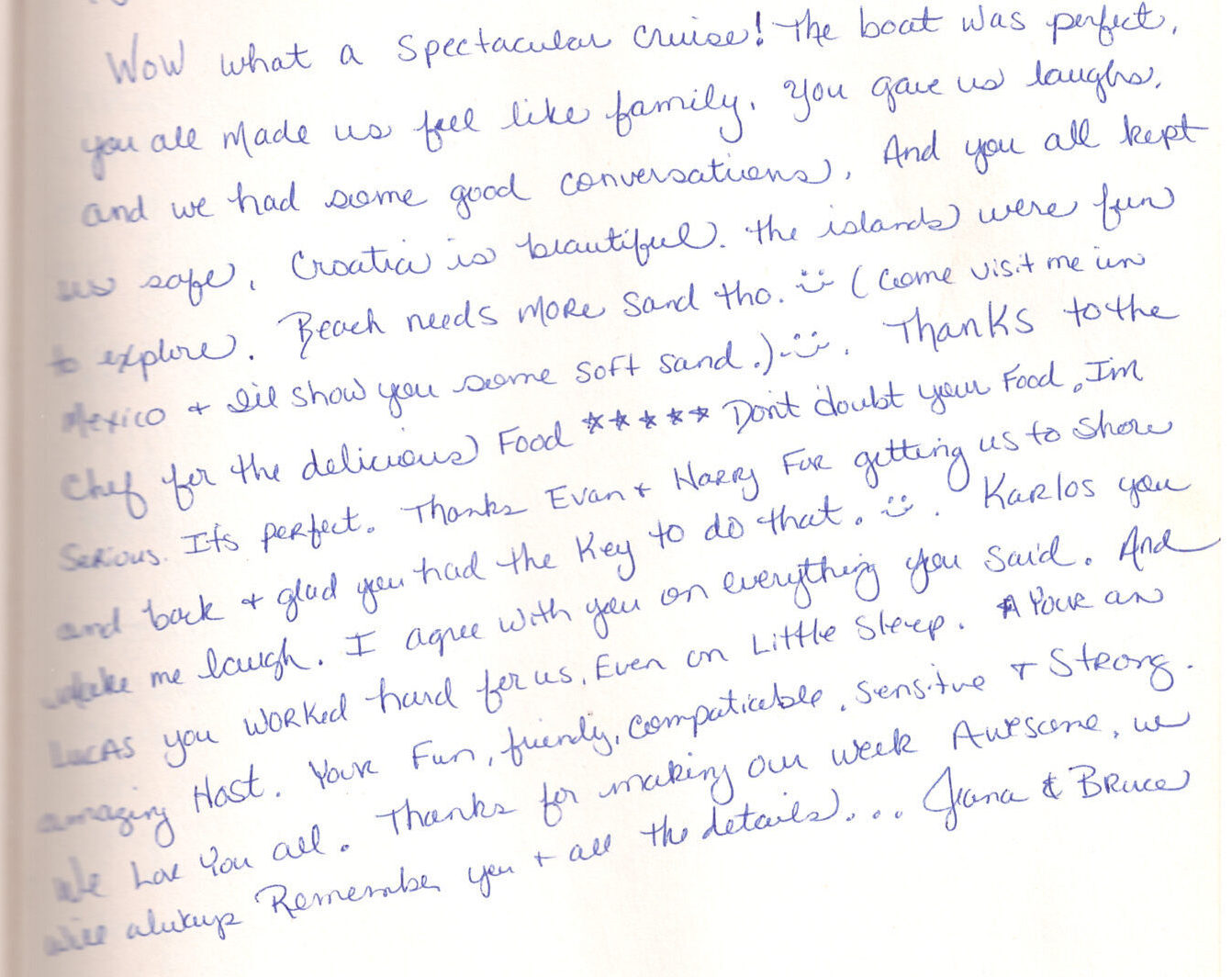 Each one of you seemed to work together so well and made for an awesome team! I think we had the BEST captain in all of the Adriatic Sea… thank you for all of your care in planning our daily route and for giving us the best possible experience each and every day (and night)… and then for your effort in communicating the plans and possibilities at all times!