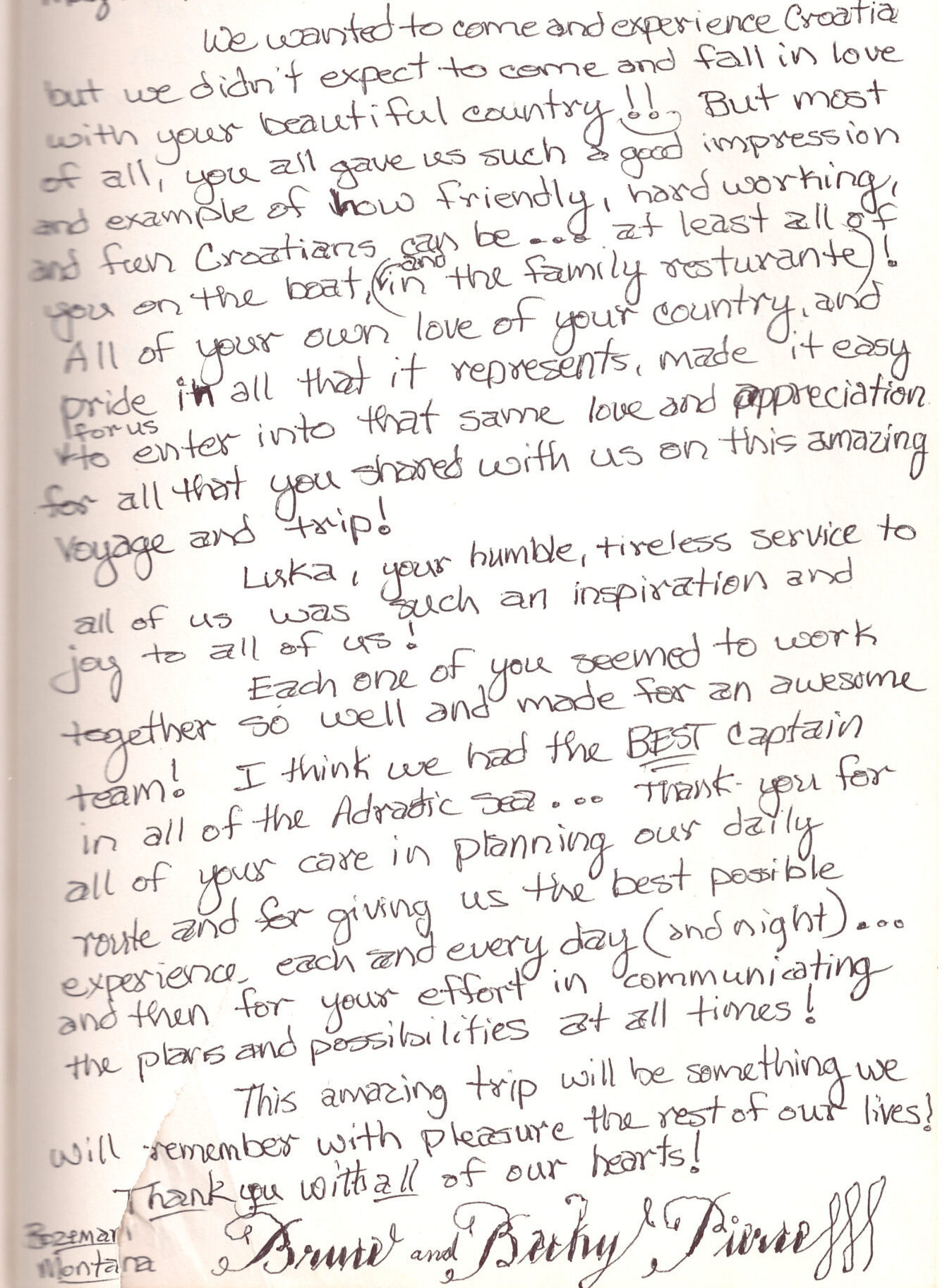 We wanted to come and experience Croatia but we didn’t expect to come and fall in love with your beautiful country!! But most of all, you all gave us such a good impression and example of how friendly, hard working, and fun Croatians can be — at least all of you on the boat (and in the family restaurant)!