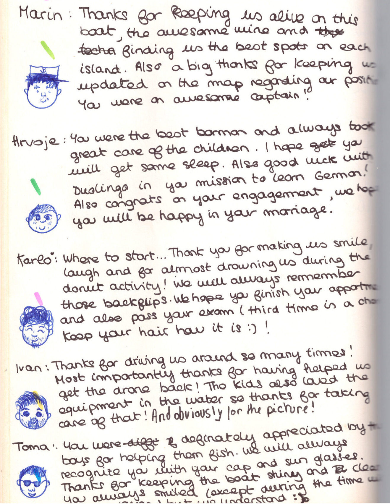 Marin: Thanks for keeping us alive on this boat, the awesome wine and finding us the best spots on each island. Also a big thanks for keeping us updated on the map regarding our position. You were an awesome captain!