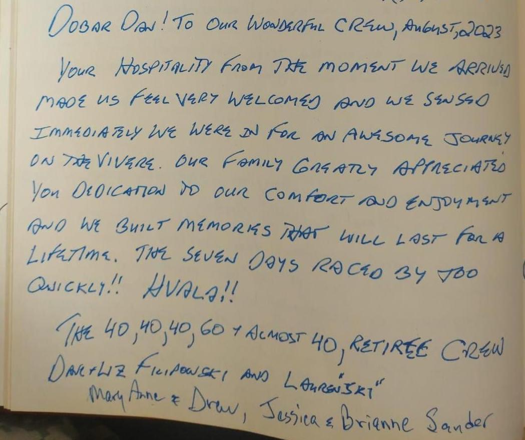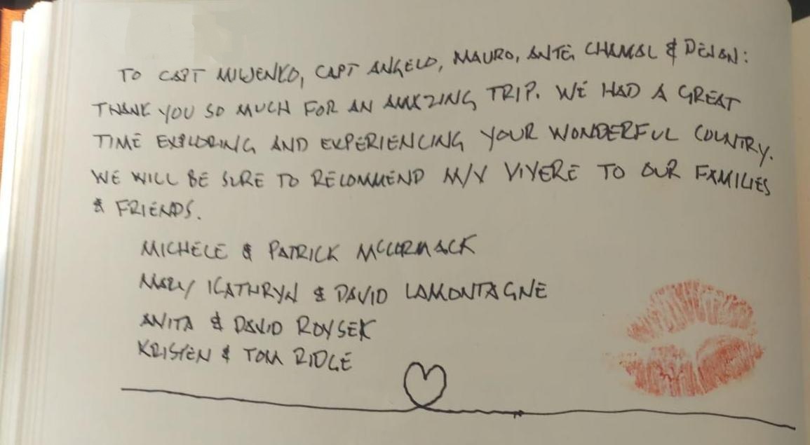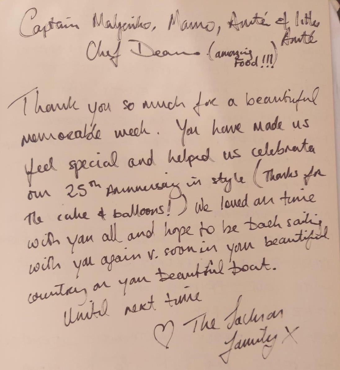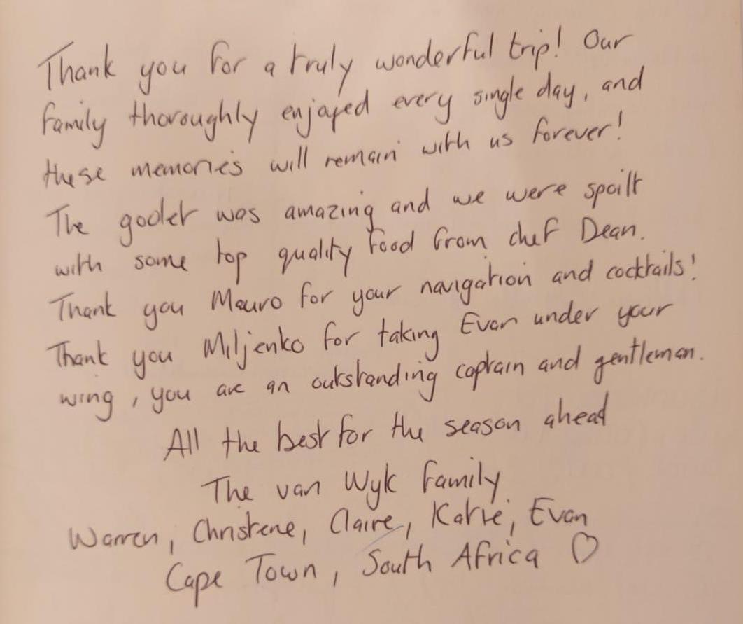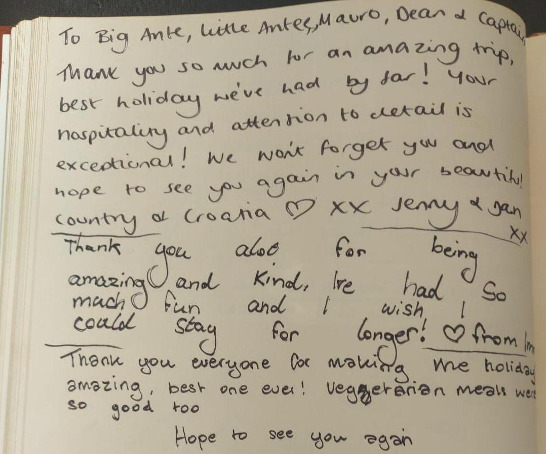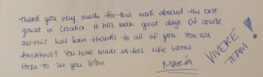 Thank you very much for this week aboard the best gulet in Croatia. It has been great days. Of course all this has been possible thanks to all of you. You are AMAZING!! You have made us feel like home.