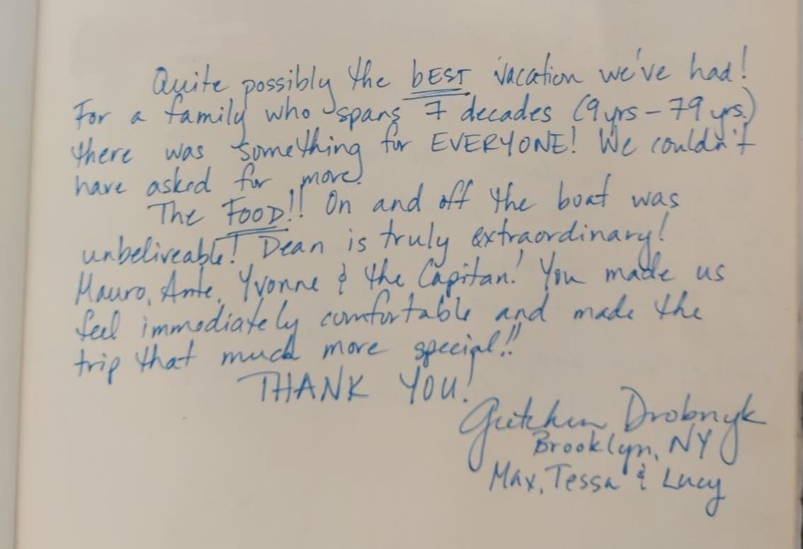 The food! On and off the boat was unbelievable. Dean is truly extraordinary! Mauro, Ante and the Captain! You made us feel immediately comfortable and made the trip that much more special!