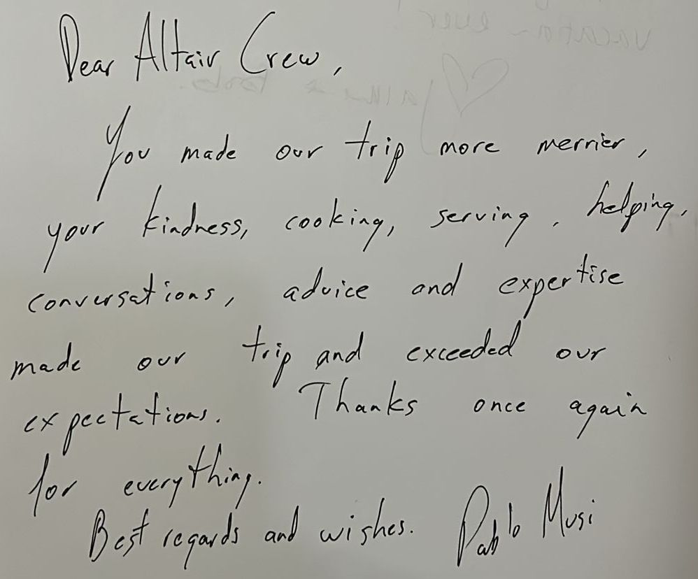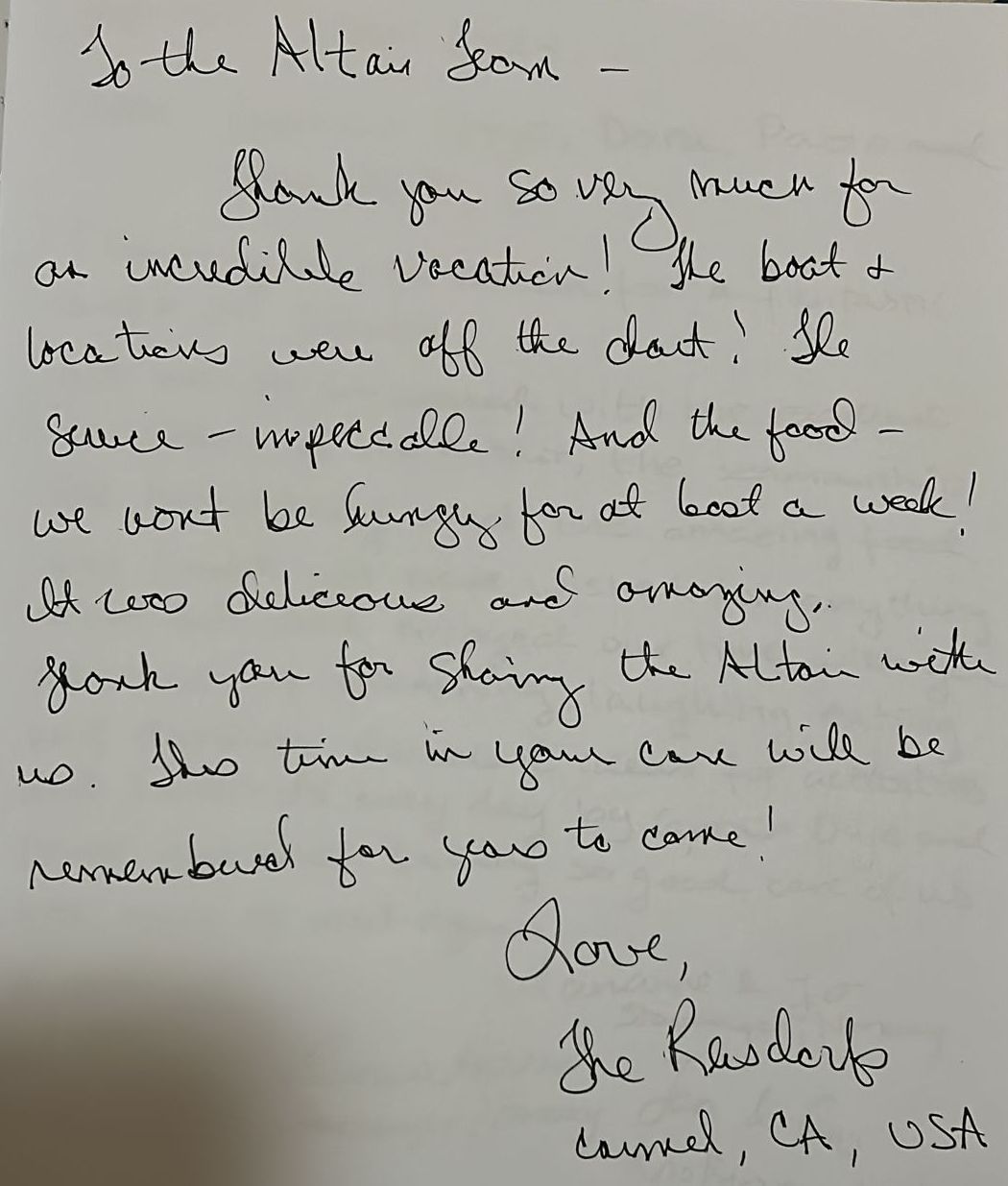 We are so impressed with the excellent condition of the Altair, the seamanship, the hospitality and the amazing food.