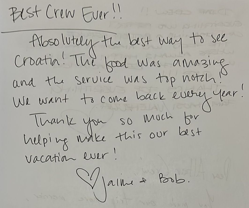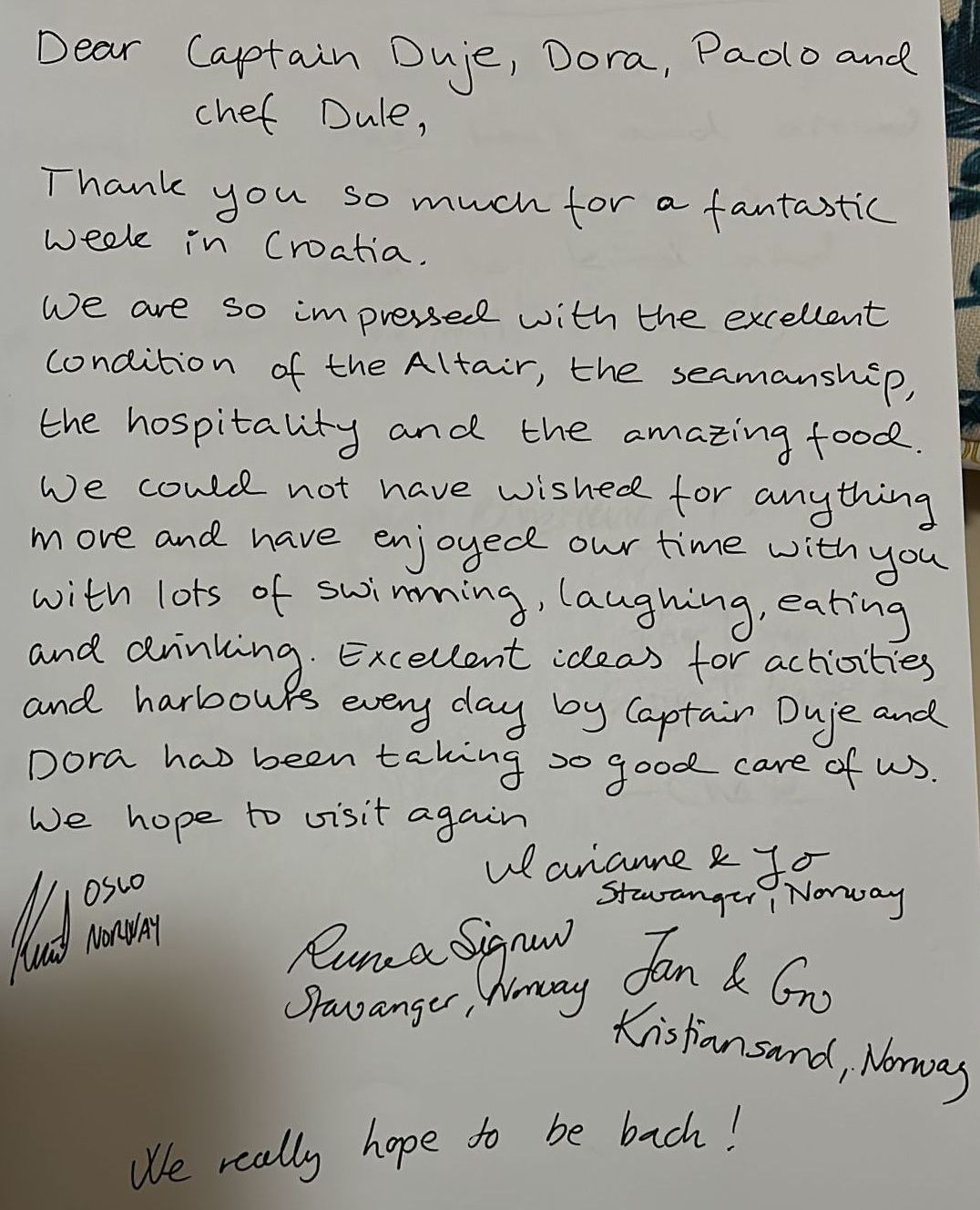 Dear Captain Duje, Dora, Paolo and chef Dule