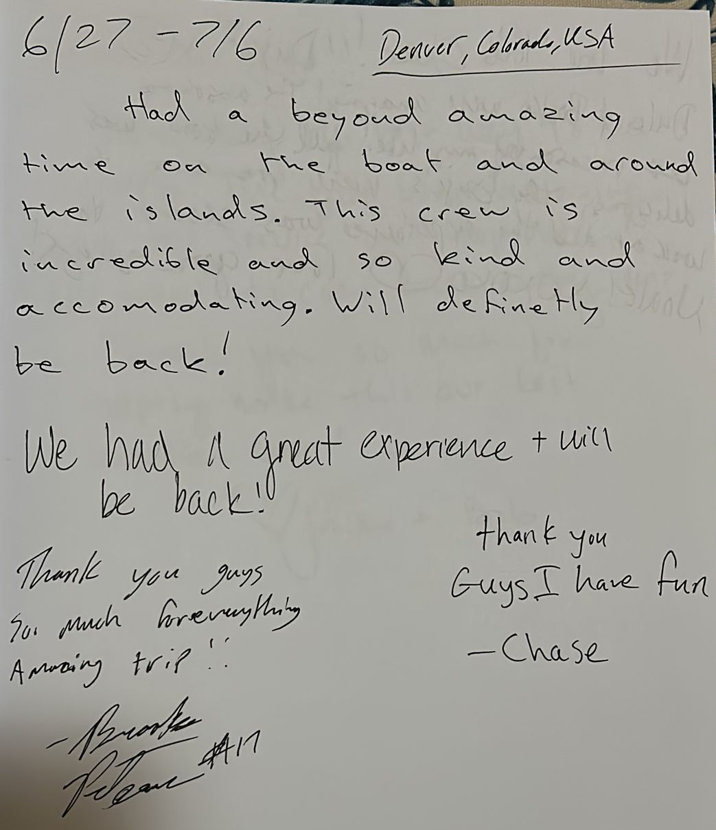 Thank you so very much for an incredible vacation! The boat & locations were off the chart!